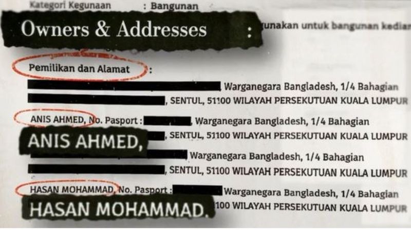 কুয়ালালামপুরে হারিস আহমেদ এবং আনিস আহমেদের বাড়ীর তথ্য (আল-জাজিরার প্রতিবেদন থেকে নেয়া ছবি)।